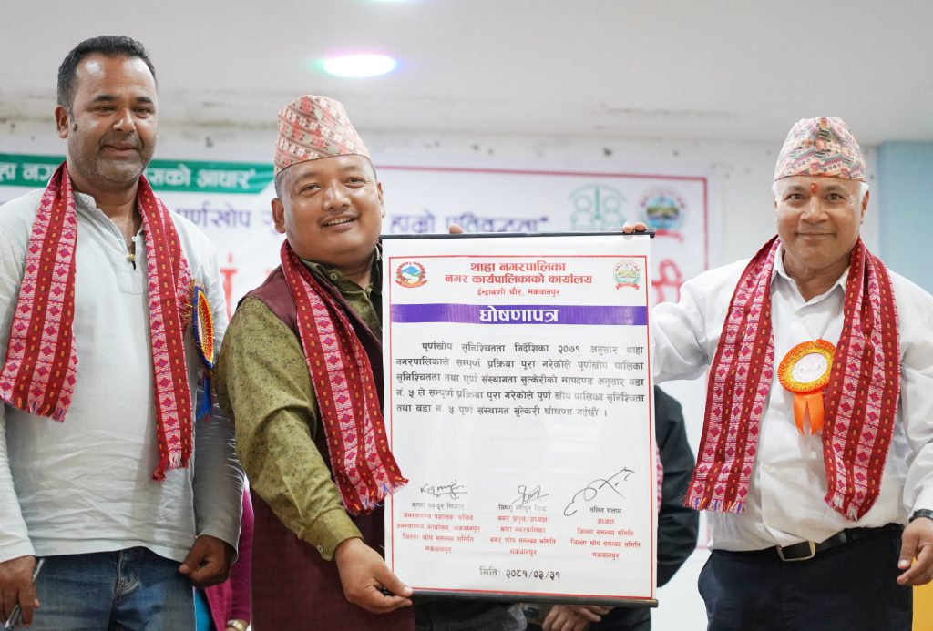 मकवानपुरको थाहा नगरपालिकालाई पूर्णखोप सुनिश्चितता पालिका घोषणा गरिएको छ । थाहालाई जिल्ला समन्वय समिति मकवानपुरका प्रमुख ललित घलान तथा जिल्ला जन स्वास्थ्य कार्यालय मकवानपुरका जनस्वास्थ्य प्रशासक कृष्ण मिजारले संयुक्त रुपमा ३१ असारमा नगरपालिकालाई पूर्णखोप सुनिश्चितता पालिका घोषणा गरेका हुन् ।
