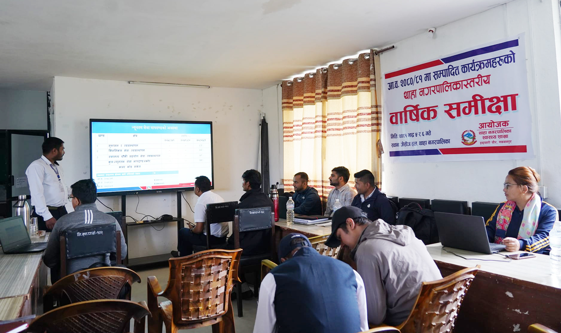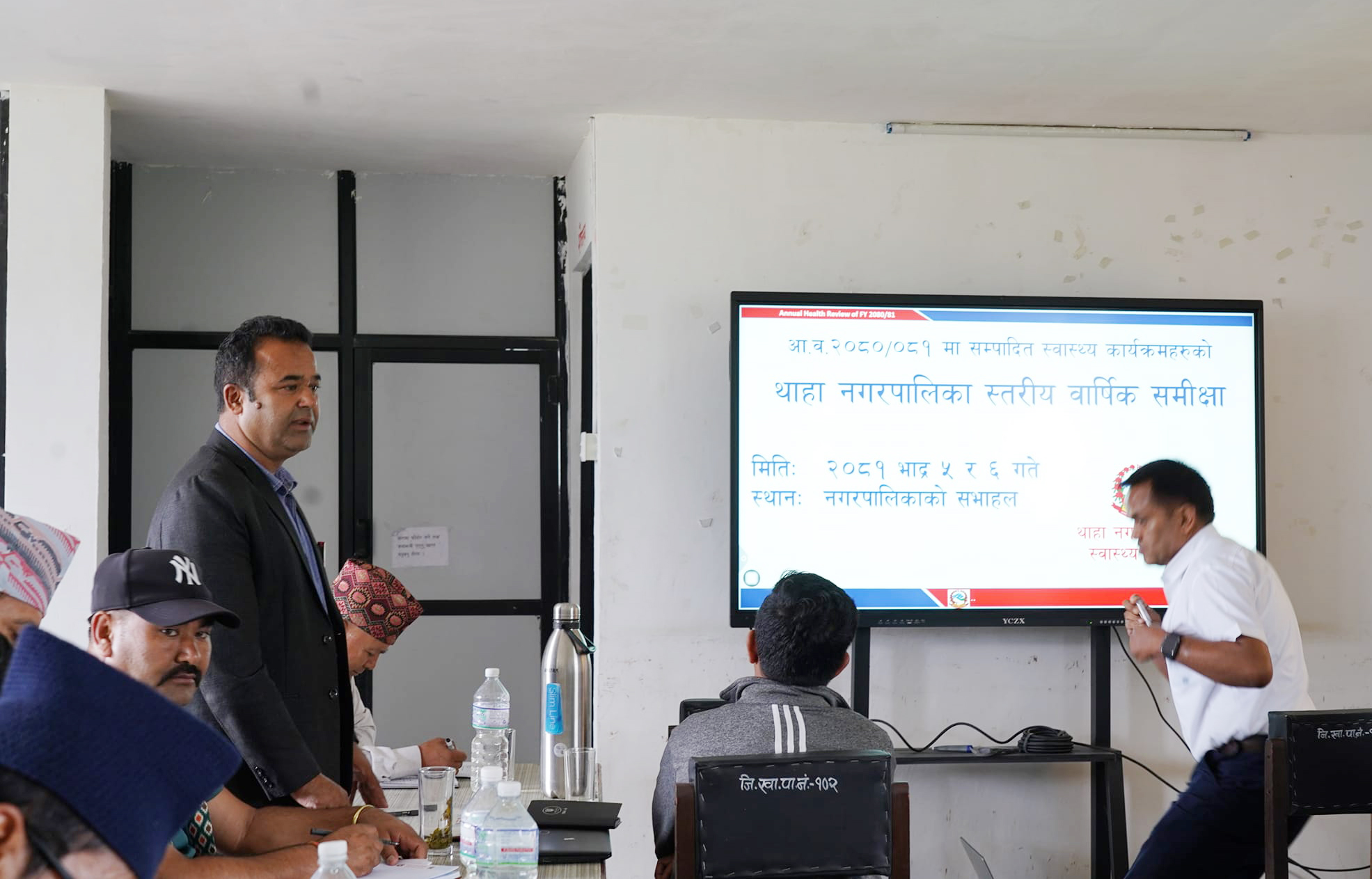 थाहा नगरपालिका स्वास्थ्य शाखाले आर्थिक बर्ष २०८०/०८१ मा सम्पादित स्वास्थ्य कार्यक्रमको समीक्षा गरेको छ । शाखाले ५ र ६ भाद्रमा नगरपालिकाको सभाहलमा कार्यक्रमको आयोजना समीक्षा गरेको हो । समीक्षामा शाखा प्रमुख मेघराज बलामीले प्रस्तुतीकरण गरेका थिए ।
