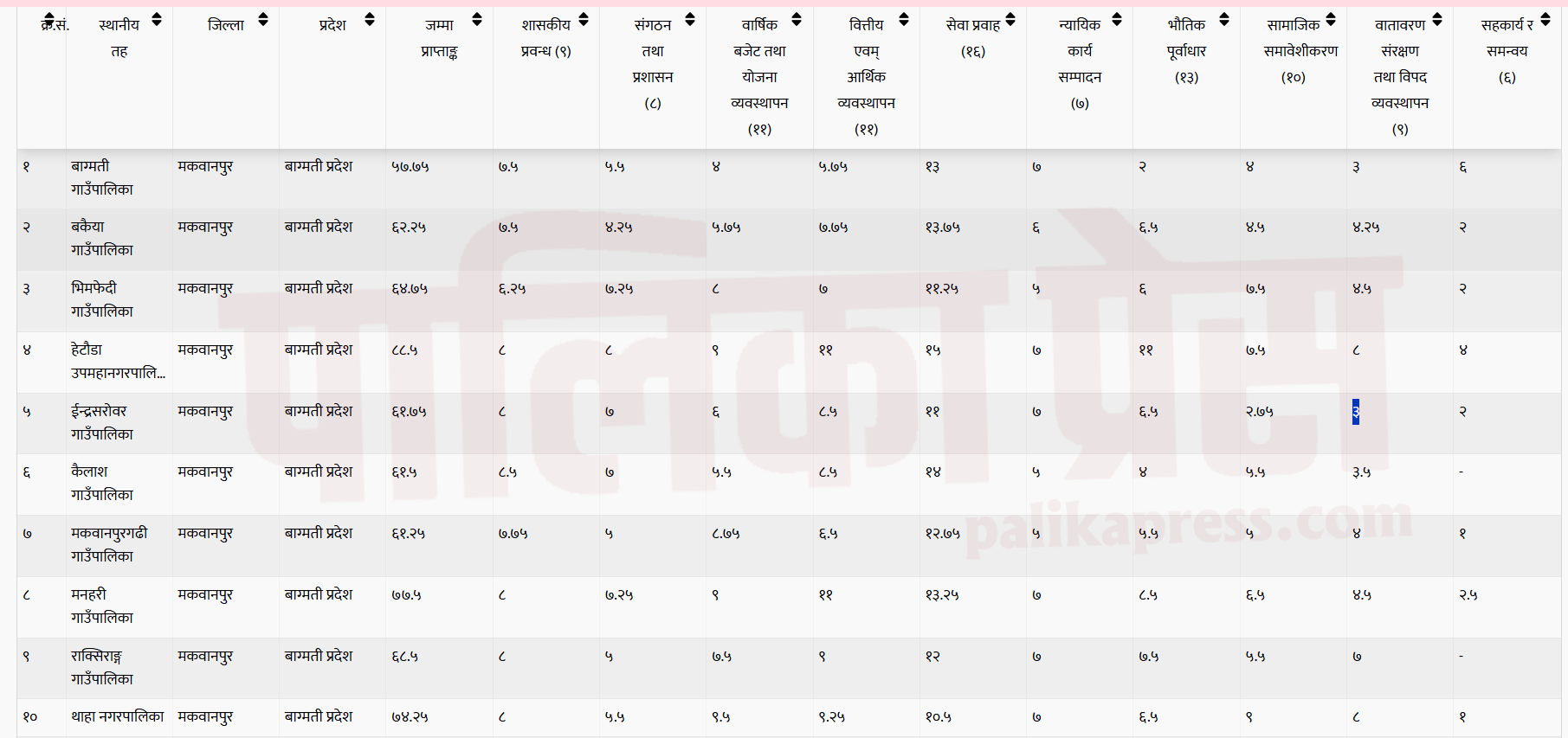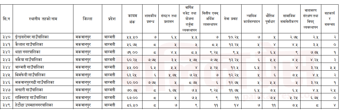 त्यसैगरी भीमफेदी गाउँपालिकाले ६४.७५ अंक दबी गरेकोमा ६३.२५ अंक, मकवानपुरगढी गाउँपालिकाले ६१.२५ दाबी गरेकोमा ६० अंक, बकैया गाउँपालिकाले ६२.२५ अंक दाबी गरेकोमा ६०.२५ अंक पाएको छ । बागमती गाउँपालिकाले ५७.७५ दाबी गरेकोमा ५५ अंक, कैलाश गाउँपालिकाले ६१.५० मा ५६.७५ अंक र राक्सिराङ गाउँपालिकाले ६८.५० अंक दाबी गरेकोमा ६७ अंक अन्तिम परीक्षण पश्चात् पाएको छ ।