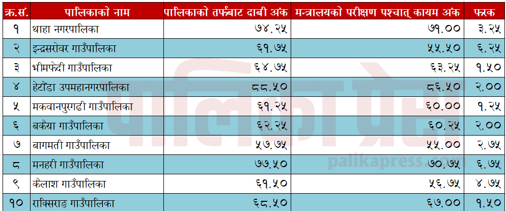 पालिकाले दाबी गरेको र मन्त्रालयबाट प्राप्त अन्तिम अंक तालिका ।