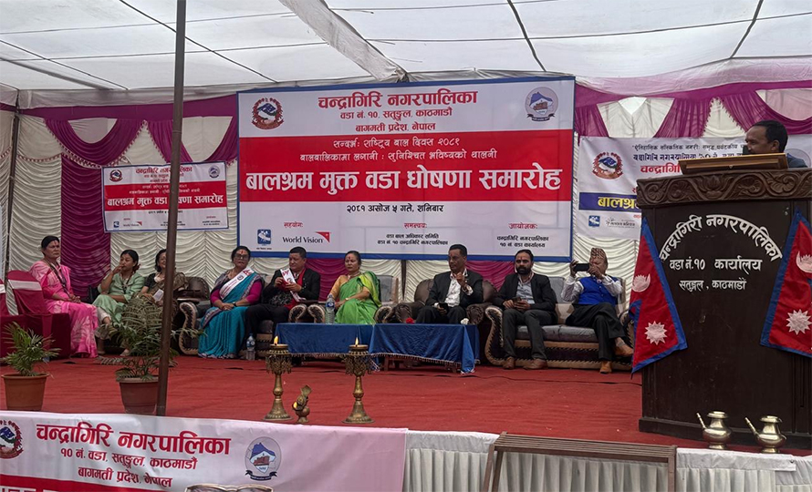 यसक्रममा शनिबार चन्द्रागिरि –१० सतुंगललाई बालश्रममुक्त घोषणा गरियो । हालसम्म नगरका १५ वडा मध्ये विभिन्न आठ वडालाई ‘बालश्रममुक्त वडा’ घोषणा गरिएका छन् ।