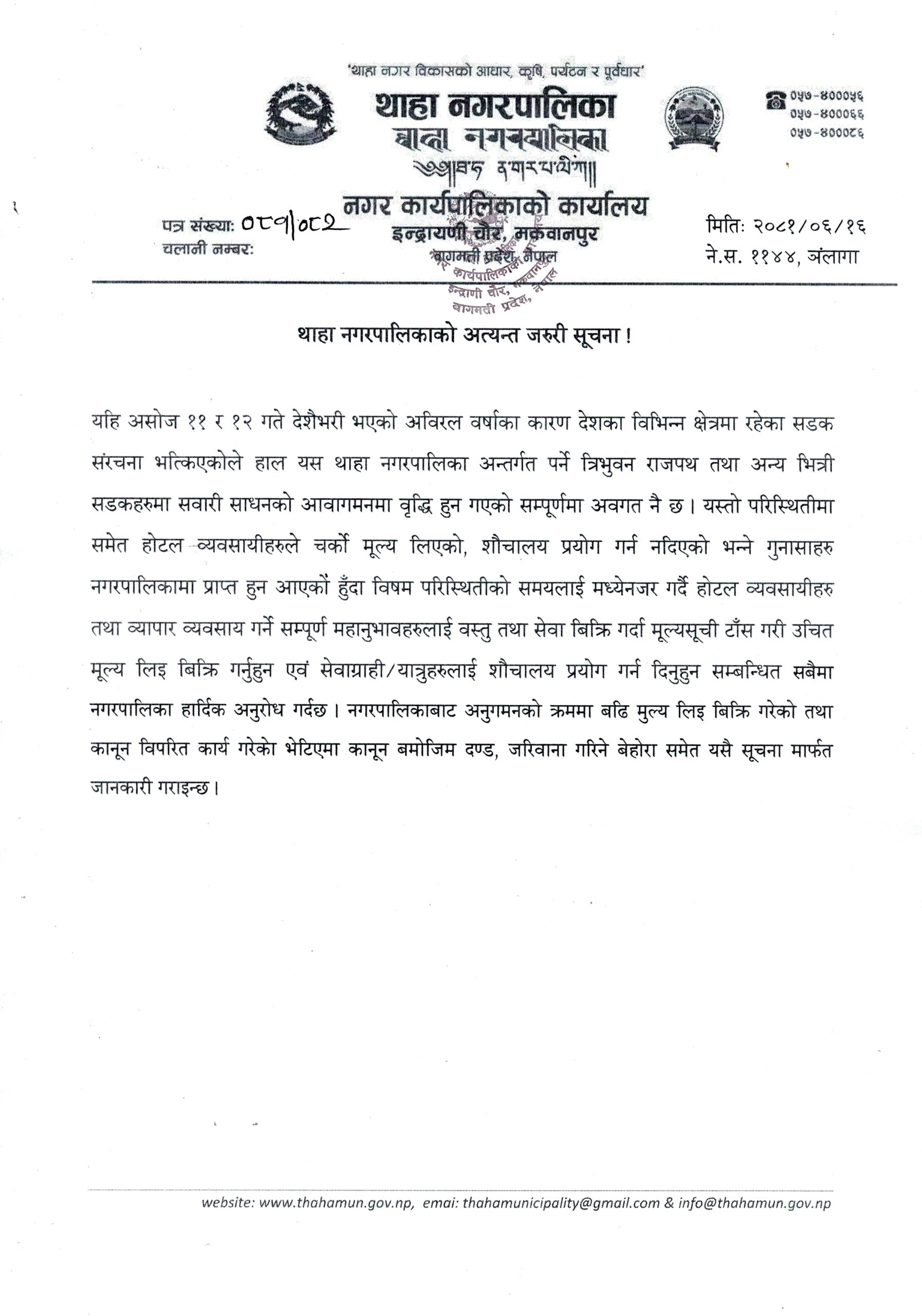 मकवानपुर थाहा नगरपालिकाले होटल व्यवसायी तथा व्यापारीले मूल्यसूची राखी उपभोक्ताहरुलाई जानकारी दिन आग्रह गरेको छ । ११ र १२ असोजको वर्षातका कारण अन्य क्षेत्रका सडक भत्किएको अवस्थामा थाहानगर अन्तर्गतको त्रिभुवन राजपथ र गणेशमानसिं मार्गमा सवारी साधनको चाप बढेपछि यात्रुहरु नठगिउन् भनेर पालिकाले यस्तो सूचना गरेको हो ।