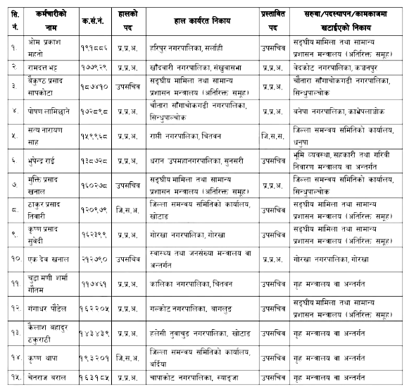 प्रशासन सिंहदरवार विशेष ब्युरोलाई प्राप्त विवरण अनुसार हरिपुर नगरपालिका, खाँदवारी नगरपालिका, चौतारा नगरपालिका, राप्ती नगरपालिका, धरान उपमहानगरपालिका, गोरखा नगरपालिका, कालिका नगरपालिका, गल्कोट नगरपालिका, हलेसी तुवाचुङ नगरपालिका र चापाकोट नगरपालिकाका प्रमुख प्रशासकीय अधिकृतहरूलाई अन्यत्र नगरपालिका, जिल्ला समन्वय समिति तथा मन्त्रालयहरूमा सरुवा गरिएको छ ।