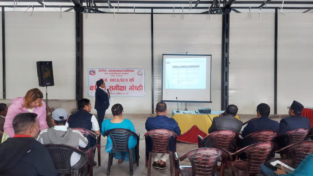 हेटौंडा उपमहानगरपालिकाको आर्थिक वर्ष २०८०/०८१ मा भएका कामको वार्षिक समिक्षा भएको छ । ३० कार्तिकमा भएको समिक्षा कार्यक्रमको अध्यक्षता ग्रहणगर्दै नगर प्रमुख मिनाकुमारी लामाले जनतालाई समस्यामा नपारी सेवा दिन निर्देशन दिइन् । उनले जनतालाई दुःख नहुने गरी सेवा प्रदान गर्नु स्थानीय सरकारको पहिलो दायित्व भएको बताइन् । स्थानीय तहले अघिल्लो आर्थिक वर्षको समीक्षा अर्को आर्थिक वर्षको कार्तिक मसान्तसम्म गरिसक्नुपर्ने कानूनी व्यवस्था छ ।