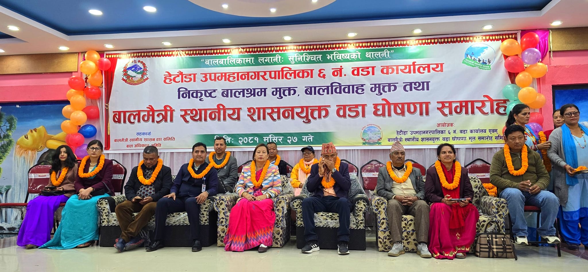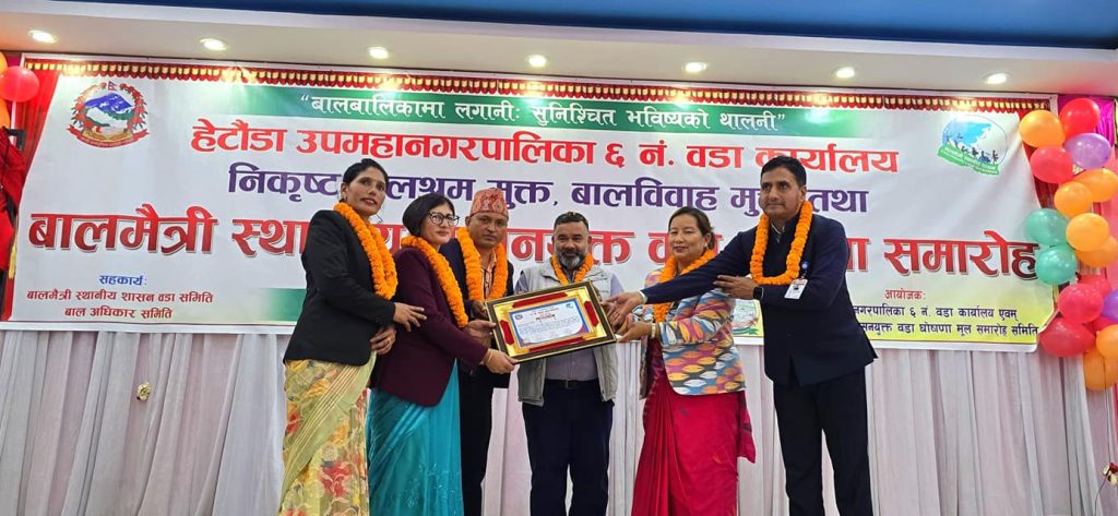 हेटौंडा उपमहानगरपालिका–६ लाई निकृष्ट बालश्रममुक्त, बालविवाहमुक्त तथा बालमैत्री स्थानीय शासनयुक्त वडा घोषणा गरिएको छ । २७ मंसिरमा एक औपचारिक कार्यक्रमको आयोजना गरी ६ नं. वडालाई उपमहानगरपालिकाको १० औं वडाका रुपमा बालमैत्री वडा घोषणा गरिएको हो ।