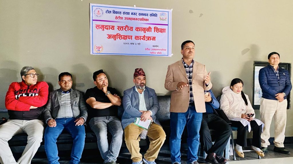 मकवानपुरको हेटौंडा उपमहानगरपालिका वडा नम्वर १२ र १३ मा रहेका टोल विकास संस्था एवम् अन्य संघ–संस्थाका पदाधिकारी एवम् सदस्यहरूको लागि समुदाय स्तरीय कानूनी शिक्षा अनुशिक्षण कार्यक्रमको आयोजना गरिएको छ ।