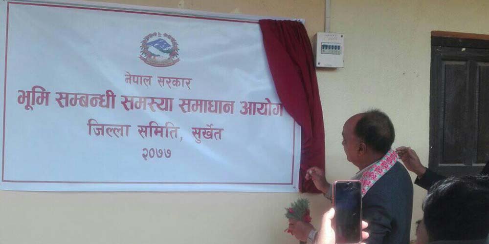 राष्ट्रिय भूमि आयोग सुर्खेतले पहिलो चरणमा यहाँका पाँच स्थानीय तहसँग जग्गाधनी पुर्जा वितरणका लागि सम्झौता गरेको छ । आयोगले ती स्थानीय तहमा सेवा कार्यालय स्थापना गर्दै जग्गाको विवरण सङ्कलन थालेको हो । आयोगको जिल्ला कार्यालयका अनुसार पहिलो चरणमा भेरीगङ्गा नगरपालिका, गुर्भाकोट नगरपालिका, चौकुने गाउँपालिका तथा दोस्रो चरणमा वीरेन्द्रनगर र पञ्चपुरी नगरपालिकासँग जग्गाधनी पुर्जा वितरणका लागि सम्झौता गरिएको छ । आयोगको टोलीले स्थानीय तहमै पुगेर सेवा केन्द्रमार्फत भइरहेका गतिविधिको अवलोकनसमेत गरिसकेको छ ।
