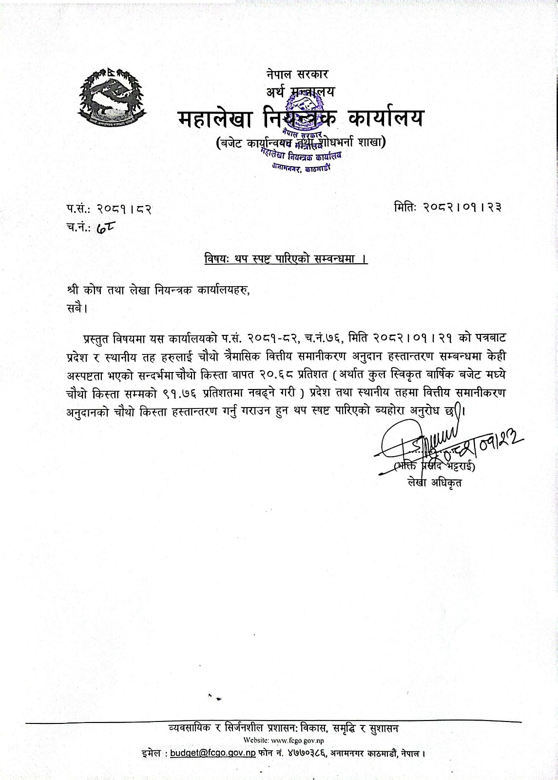 गत माघ २९ गते महालेखा नियन्त्रक कार्यालयले सबै कोष तथा लेखा नियन्त्रक कार्यालयलाई पत्र पठाउँदै तेस्रो किस्ताबापतको वित्तीय समानीकरण अनुदानमा २५ प्रतिशतमध्ये १३ दशमलव २४ प्रतिशत अर्थात् वार्षिक बजेटको ६३ दशमलव २४ प्रतिशत नबढ्ने गरी बजेट निकासा गर्न भनेको थियो। प्रदेश तथा स्थानीय तहको चर्को विरोधपछि महालेखा नियन्त्रक कार्यालयले त्यसलाई संशोधन गरेर गत फागुन १३ गते अर्को परिपत्र गर्दै वित्तीय समानीकरण अनुदानको तेस्रो किस्ताबापतको भुक्तानी हुने रकम केही बढाएको थियो।