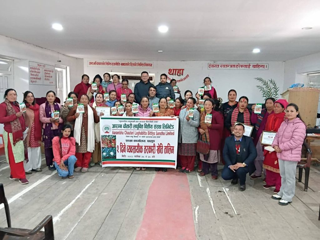 आरम्भ चौतारी लघुवित्तद्वारा आयोजित २ दिने व्यवसायिक तरकारी खेती सम्बन्धी तालिम सकिएको छ । आरम्भ चौतारी लघुवित्त वित्तीय संस्था लिमिटेड स्थानीय शाखा कार्यालय पालुङले २९ र ३० कार्तिकमा आयोजन गरेको तालिममा ५१ जना महिलाको सहभागिता रहेको थियो। कार्यक्रममा सहभागी महिलाहरूलाई “लघु उद्यमीको हात आरम्भ चौतारीको साथ“ भन्ने नारासहित व्यवसायिक कृषि प्रवद्र्धन विषयमा व्यावहारिक सीप प्रदान गरिएको थियो।