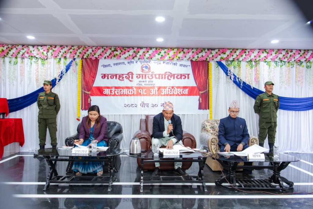 मकवानपुरको मनहरी गाउँपालिकाको १८ औँ हिउँदे अधिवेशन ३० पुसमा भएको छ । गाउँपालिका अध्यक्ष रन्जन कालाखेतीको अध्यक्षतामा भएको गाउँसभाले चालु आव २०८२/०८३ को बजेटमा उल्लेखित केही आयोजना तथा कार्यक्रमहरु संशोधन गर्ने निर्णय गरेको छ । गाउँपालिकाकी उपाध्यक्ष सीता पुलामी मगरले गाउँसभामा विभिन्न ३७ वटा योजनाहरु संशोधनको लागि पेश गरेकोमा गाउँसभाबाट सर्वसम्मत स्वीकृत भएको हो । गाउँसभामा उपाध्यक्ष पुलामीले पेश गरेको आर्थिक ऐन २०८२ को पहिलो संशोधन प्रस्ताव पनि स्वीकृत भएको छ ।