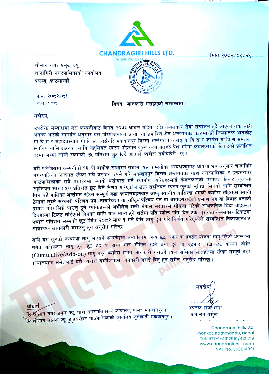 चन्द्रागिरि नगरपालिकाका स्थानीयवासीले चन्द्रागिरि केबलकार चढ्दा ५० प्रतिशत छुट पाउने भएका छन् । केबलकार सेवा प्रयोग गर्ने स्थानीयका लागि यो सुविधा लागू भएसँगै पर्यटन प्रवद्र्धन र स्थानीय सहभागिता बढ्ने अपेक्षा गरिएको छ । केबलकारको प्रवद्र्धक संस्था चन्द्रागिरि हिल्स लिमिटेडको २३ पुसमा सम्पन्न १६औँ वार्षिक साधारणसभाले १ माघबाट लागू हुने गरी मकवानपुरको थाहा नगरपालिका र इन्द्रसरोवर गाउँपालिका तथा काठमाण्डौंको चन्द्रागिरिकाका स्थानीयवासीलाई पनि ५० प्रतिशत छुट दिने निर्णय गरेको थियो।