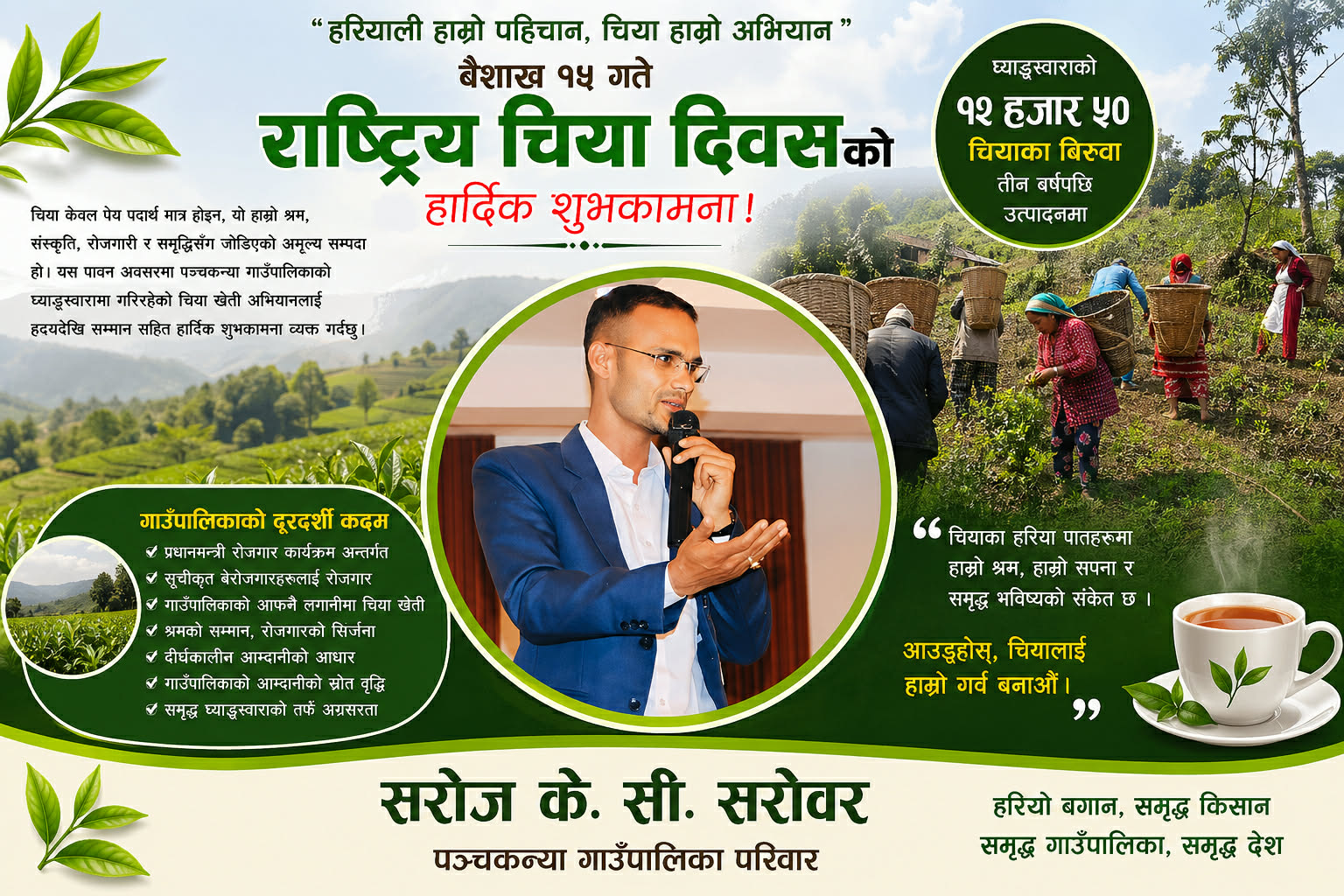 पञ्चकन्या गाउँपालिकाको घ्याङस्वारा चिया खेती अभियान आज चिया दिवसको अवसरमा गौरवका साथ प्रस्तुत गर्न मिल्ने सफल उदाहरण बनेको छ। हरियो बगान बढोस्, उत्पादन फस्टाओस्, श्रमको सम्मान होस्, गाउँपालिकाको आम्दानी बढोस्, र “पञ्चकन्या घ्याङस्वारा चिया” नेपालको नयाँ पहिचान बनोस्—यही शुभकामना।