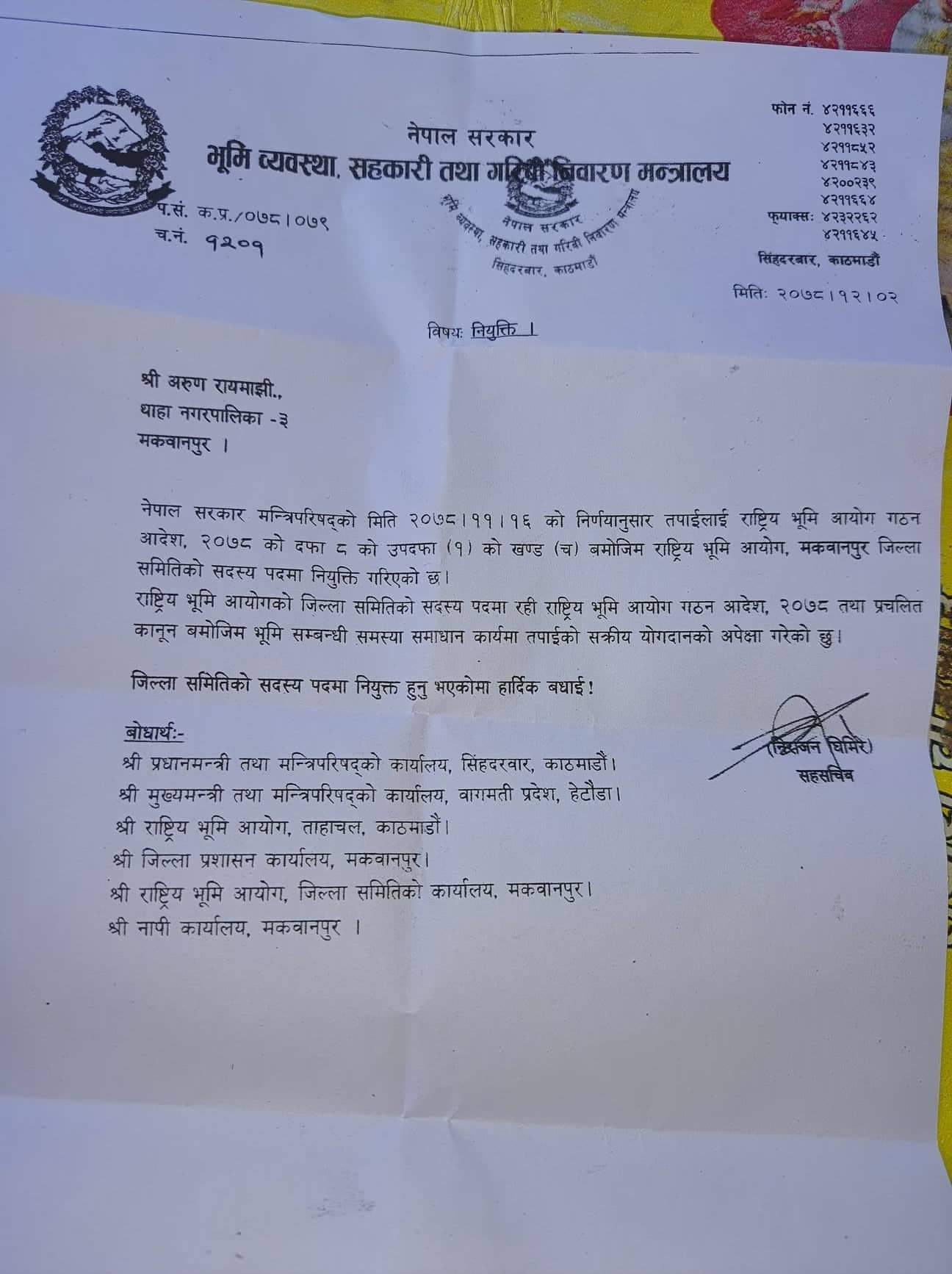 मन्त्री परिषदले थाहा नगरका अरुण रायमाझीलाई राष्ट्रिय भूमि आयोग मकवानपुर जिल्ला समितिको सदस्यमा नियुक्त गरेको छ ।