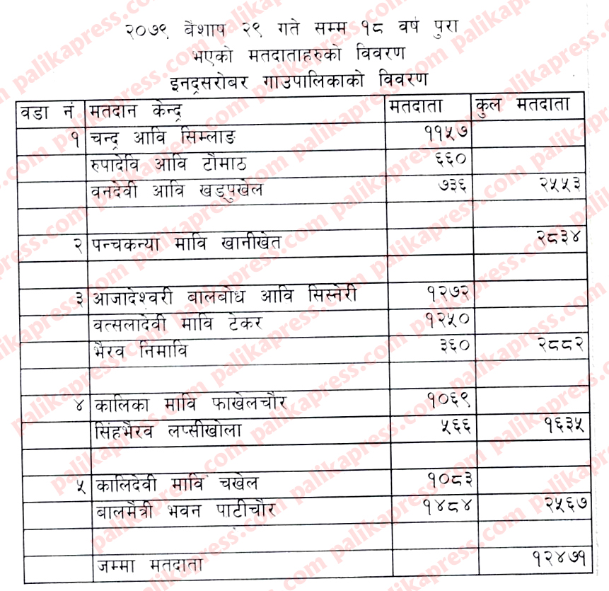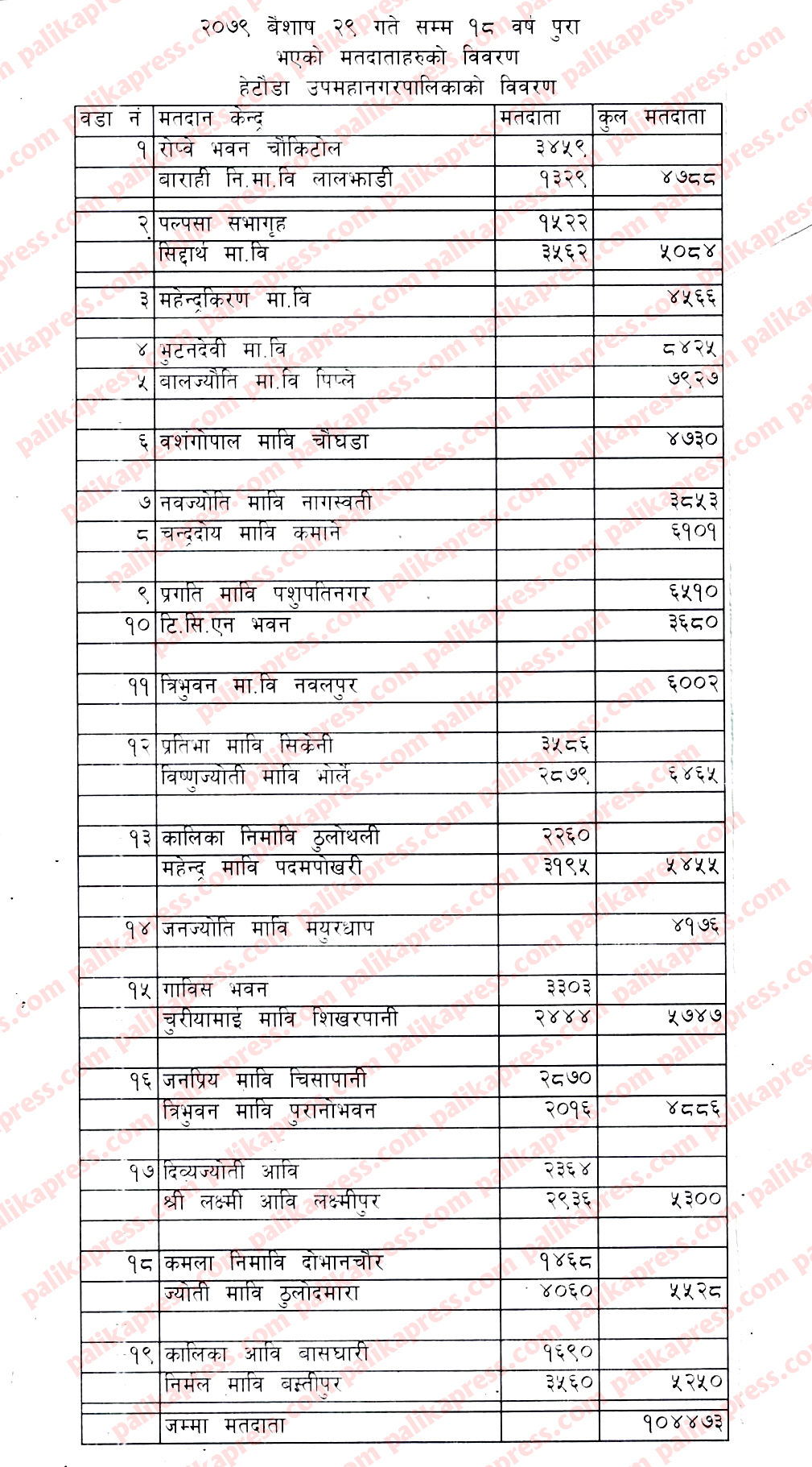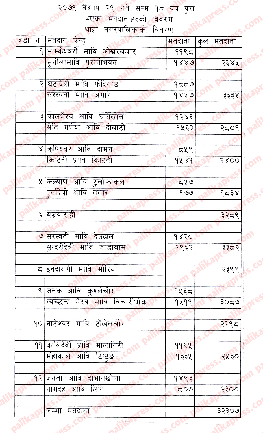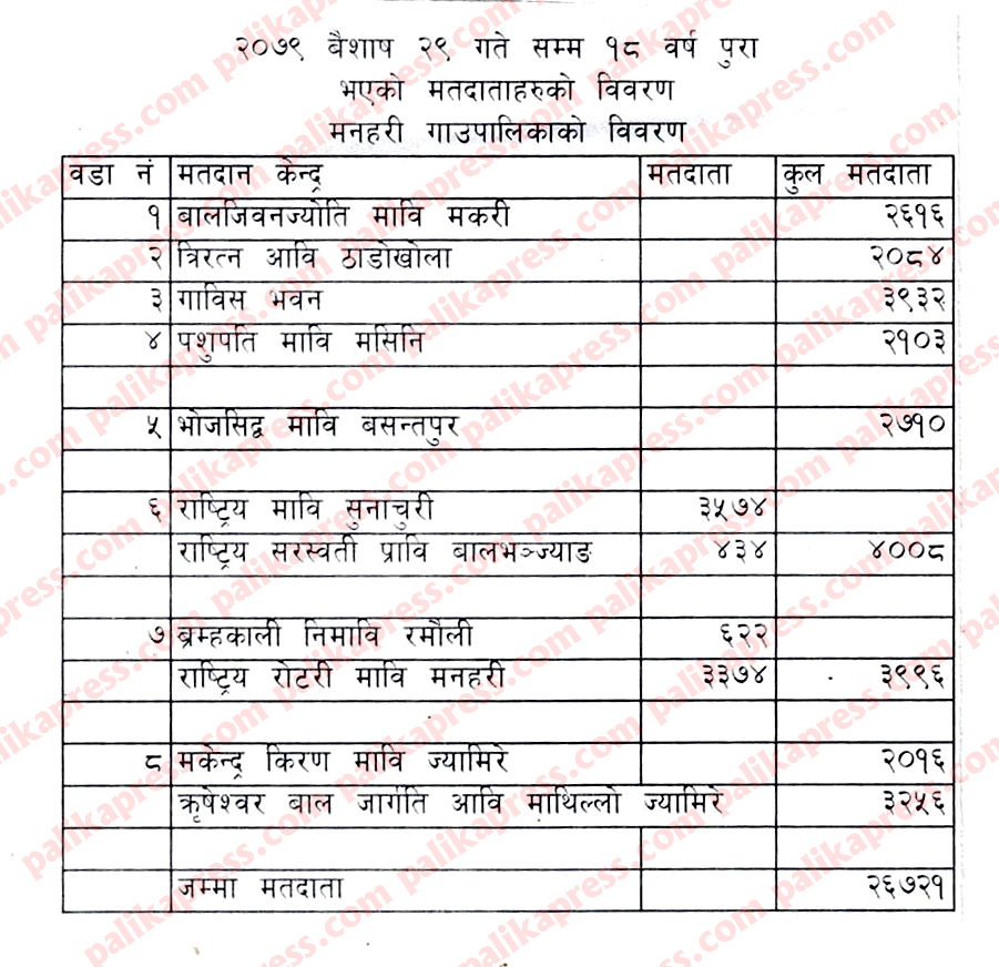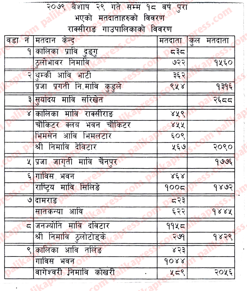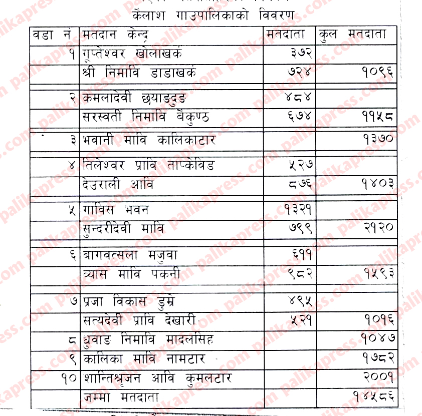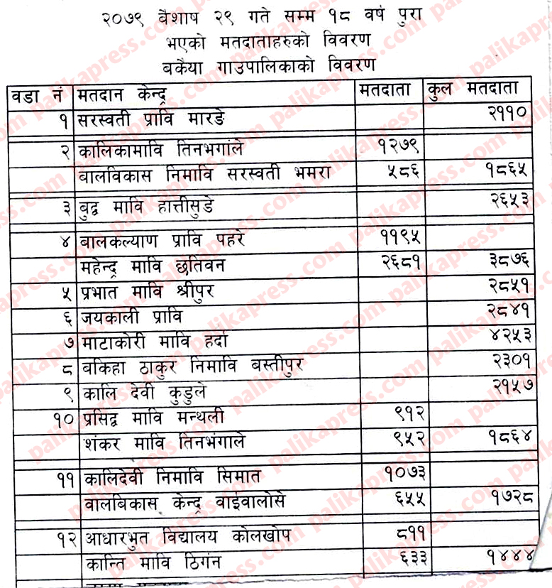 हेर्नुहोस् १० वटै पालिकाका वडाका मतदान स्थल अनुसारको मतदाता संख्या: