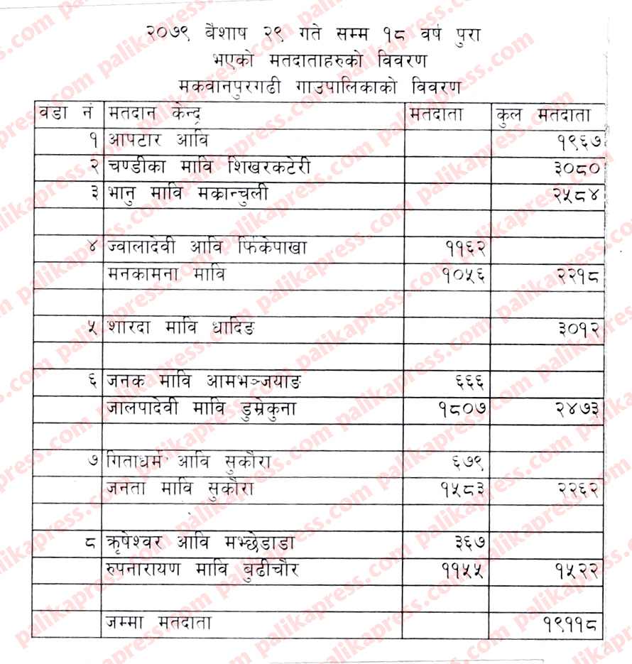 मकवानपुरका सबै स्थानीय तहको वडागत मतदाता संख्या सार्वजनिक भएको छ । २९ वैशाख, २०७९ सम्म १८ वर्ष पूरा हुने मतदाताहरुको विवरण प्रदेश निर्वाचन कार्यालय मकवानपुरले सार्वजनिक गरेको हो ।