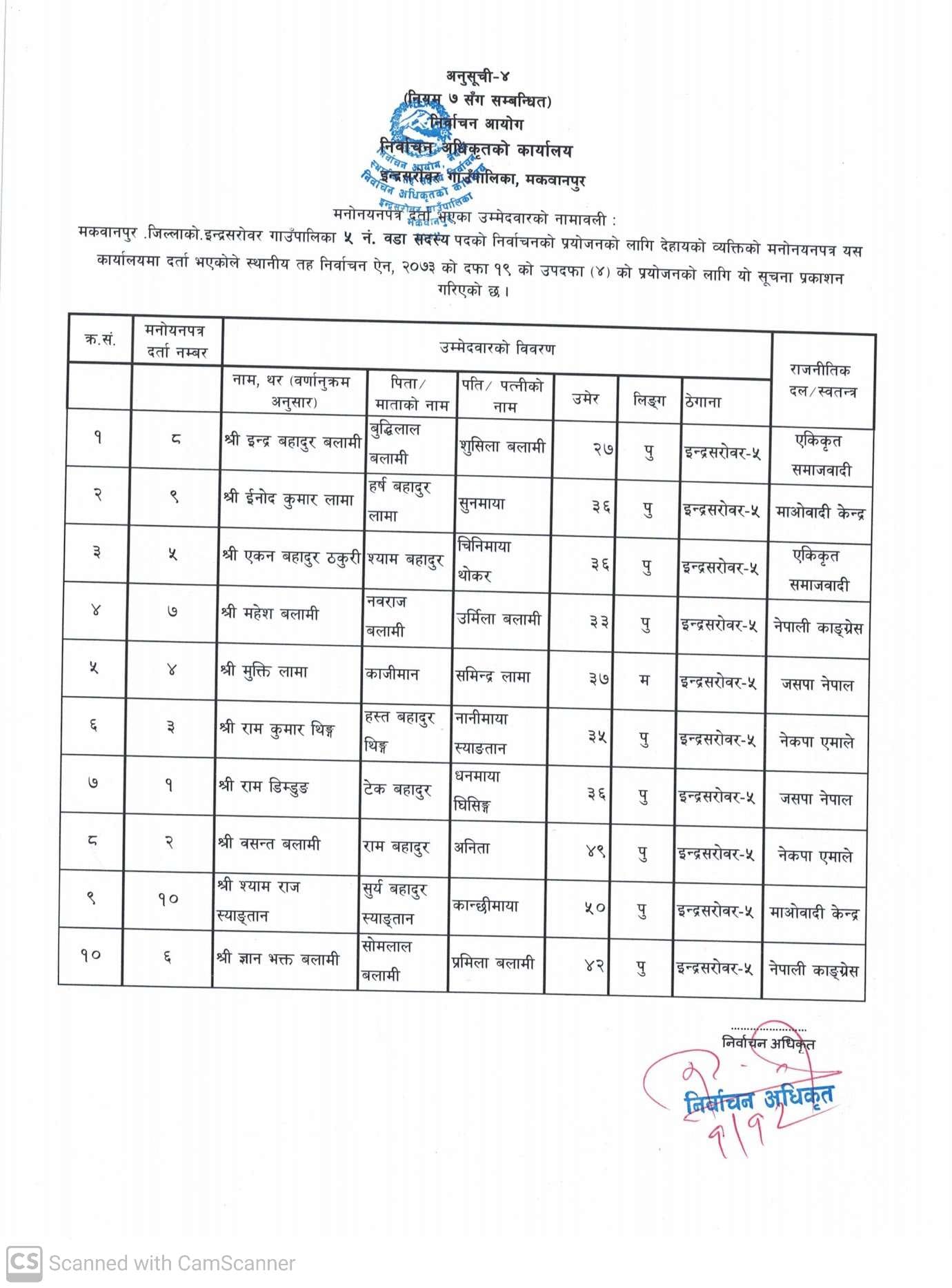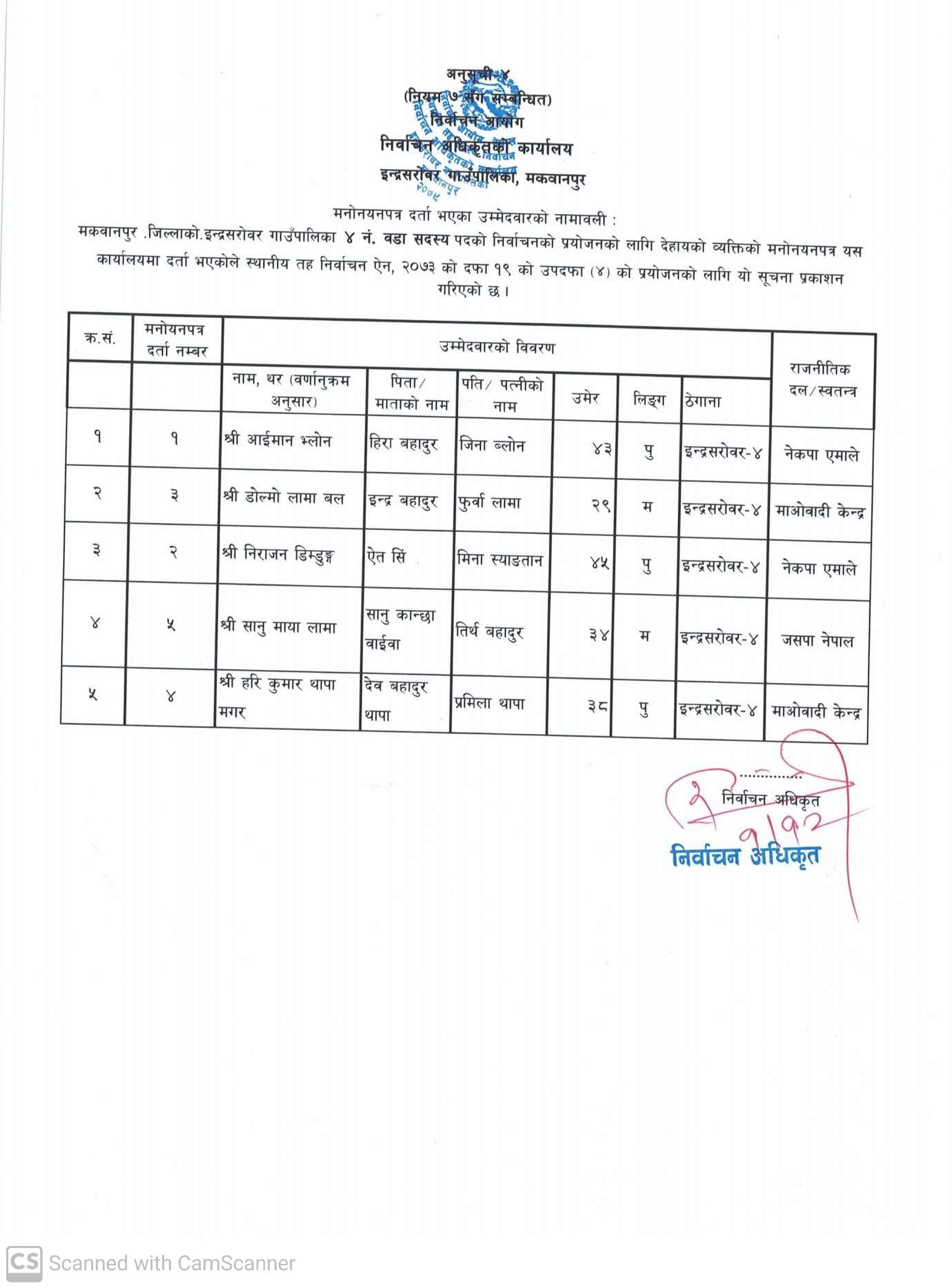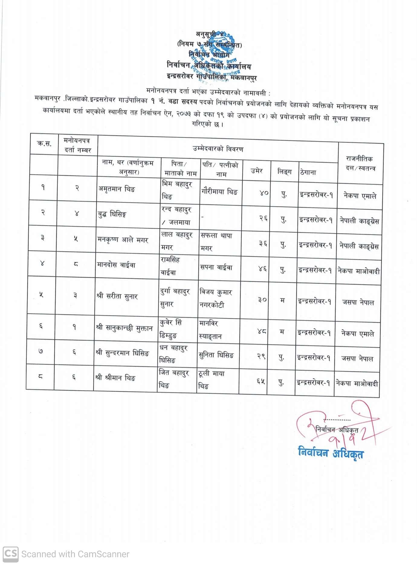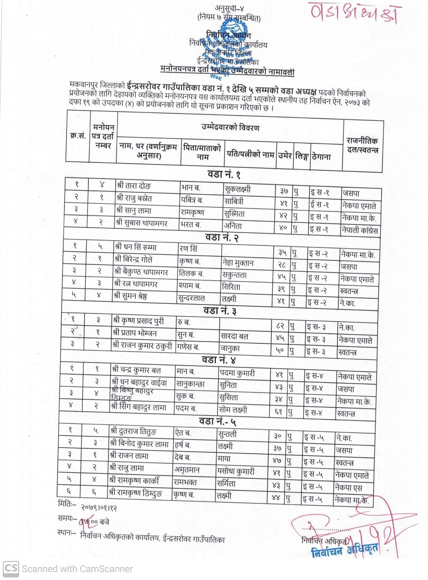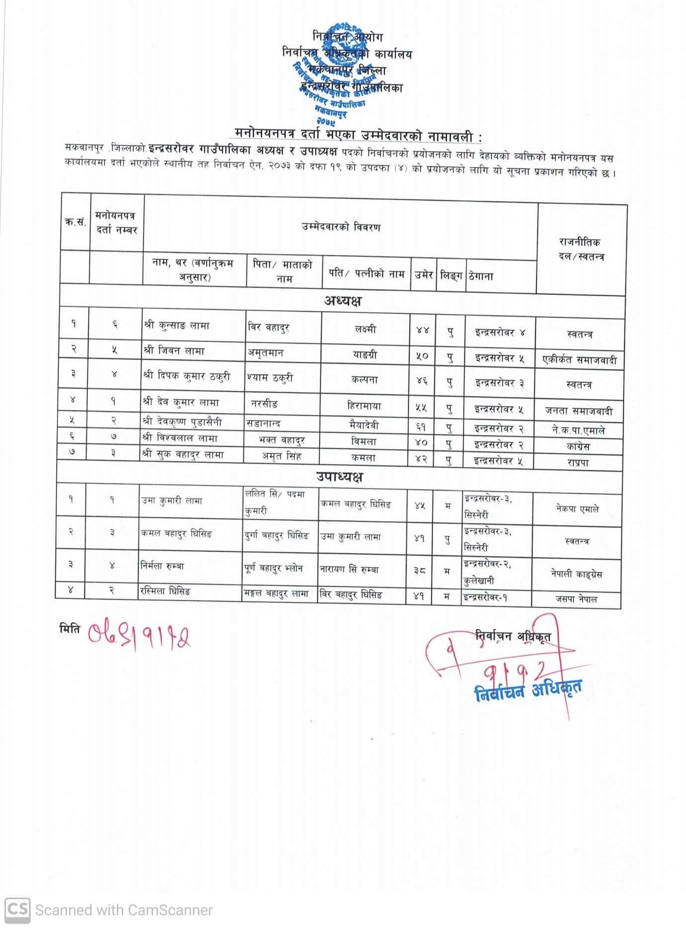 ५ वटा वडा रहेको इन्द्रसरोवरमा १ जना पालिका अध्यक्षका लागि ७ जना र १ पालिका उपाध्यक्षको लागि ४ जनाको उमेद्वारी परेको छ ।
