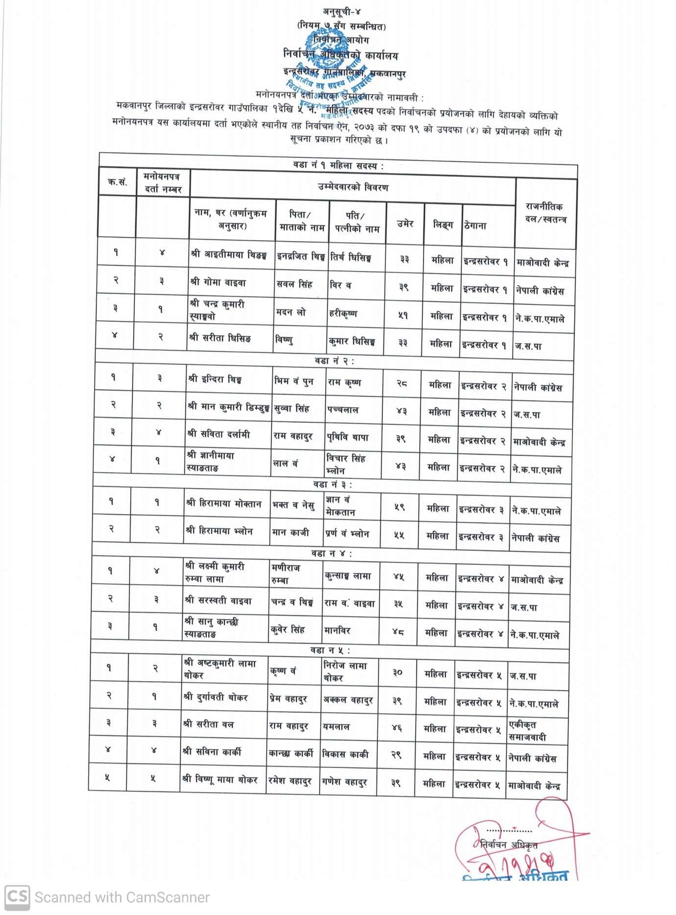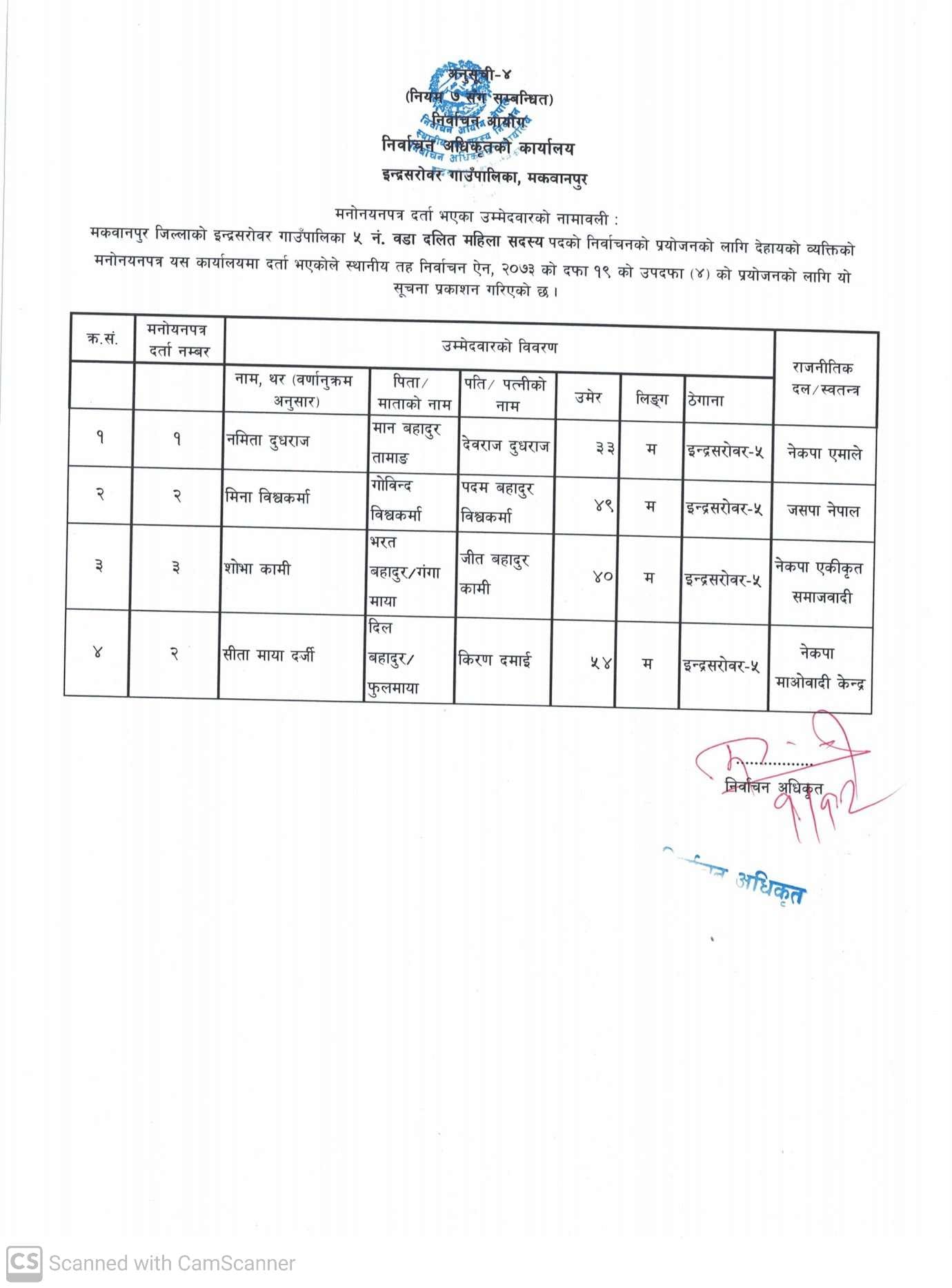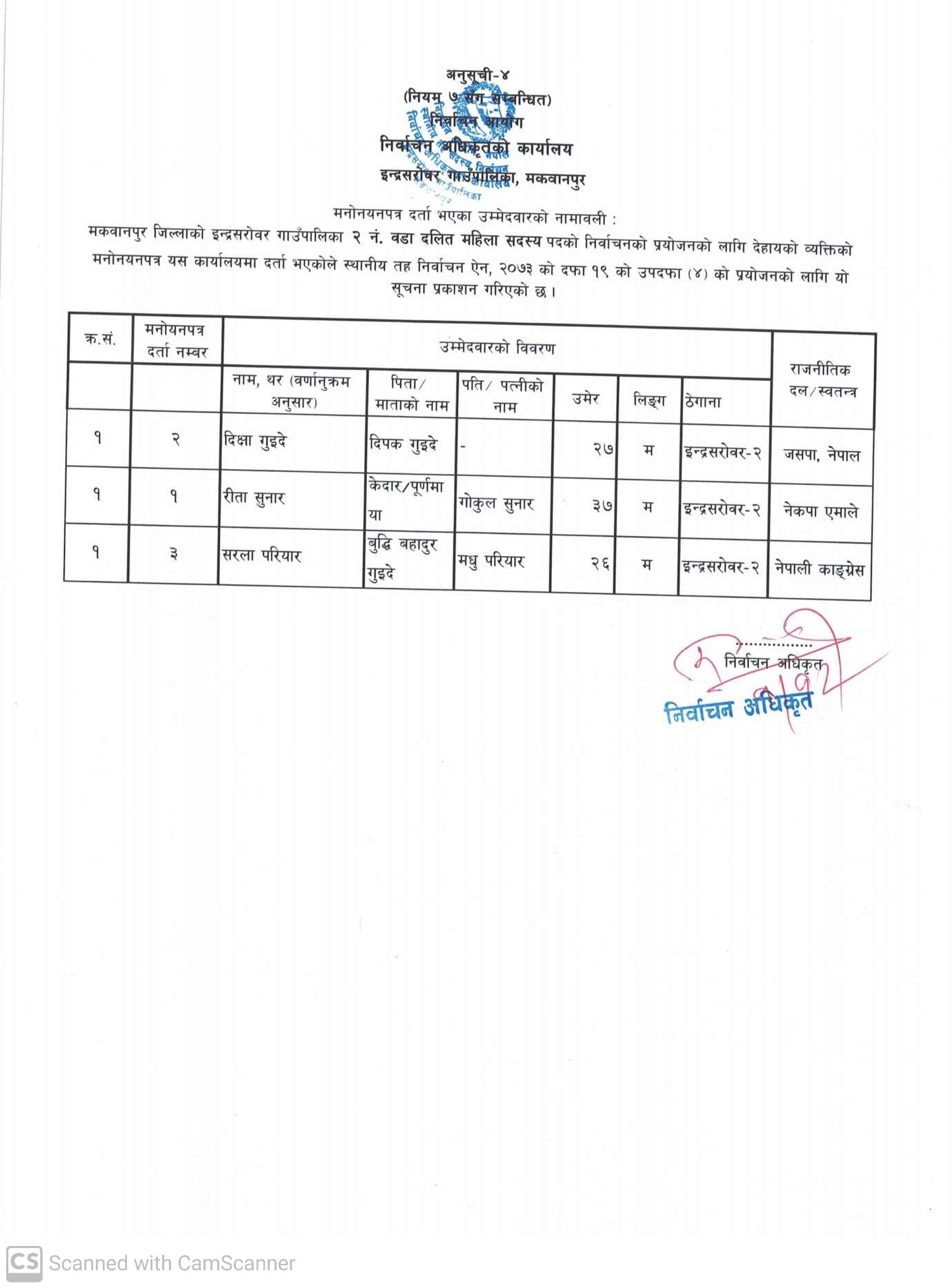 यसैबीच नेकपा एमालेबाट दलित महिला सदस्य पदमा मनोनयन दर्ता गरेकी वडा नम्बर १ की लक्ष्मी दमाई र वडा नम्बर ४ की सावित्री सुनार निर्विरोध निर्वाचित भएकी छिन् ।