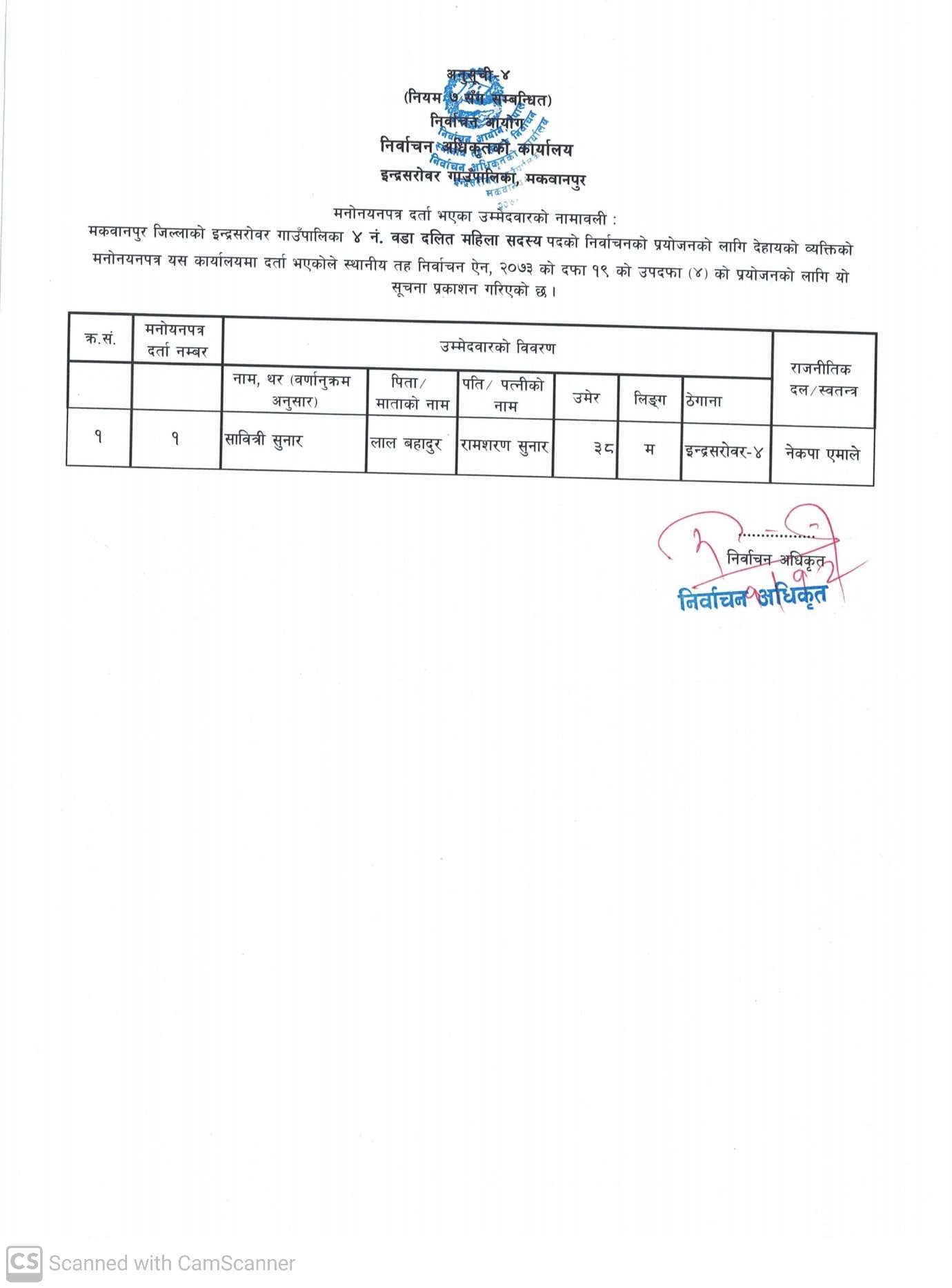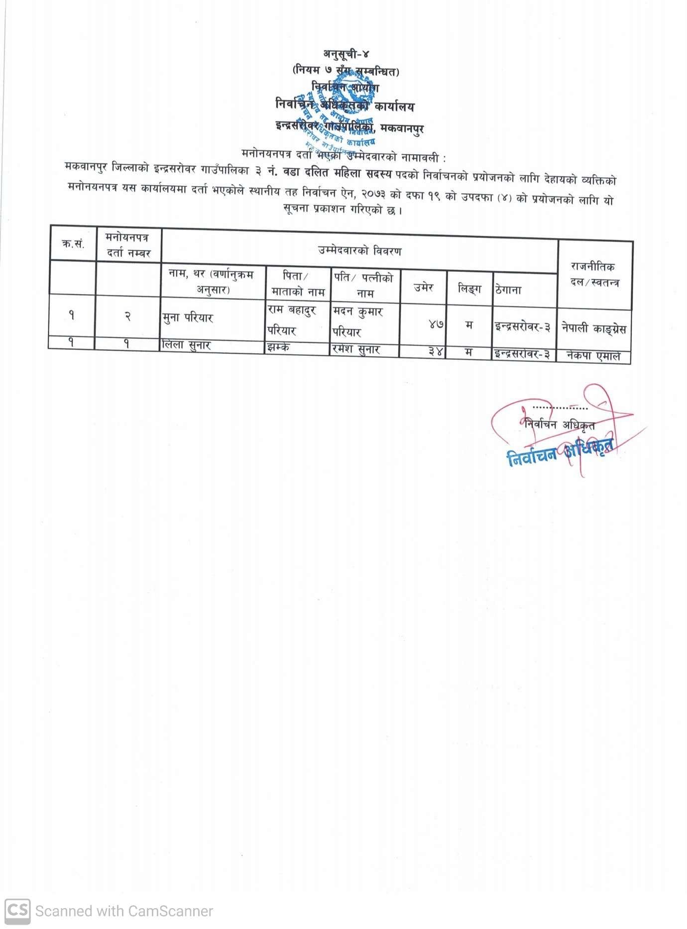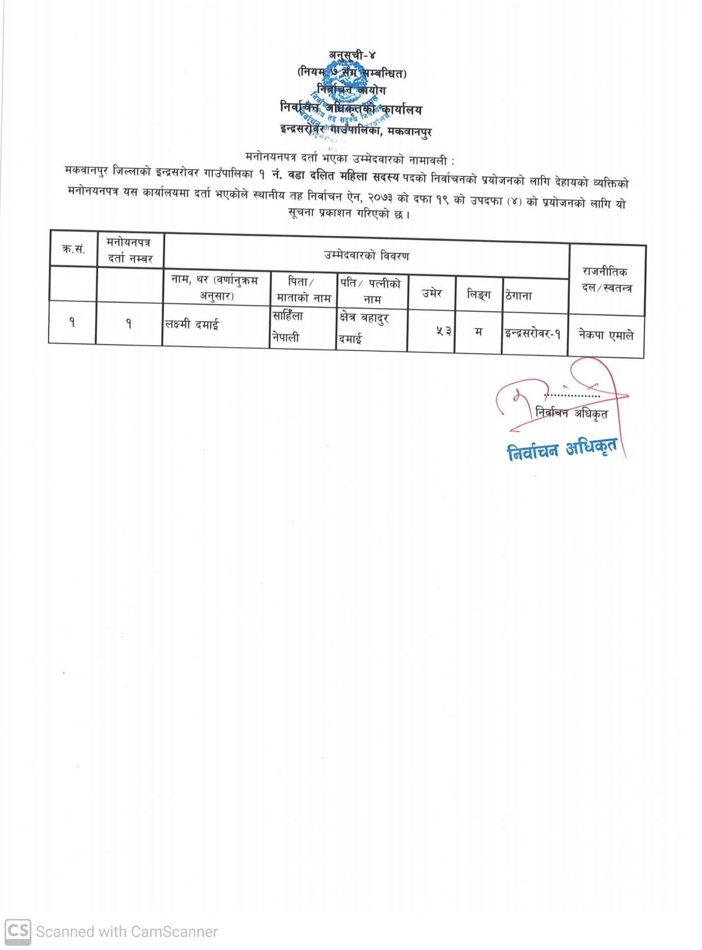 यसैबीच नेकपा एमालेबाट दलित महिला सदस्य पदमा मनोनयन दर्ता गरेकी वडा नम्बर १ की लक्ष्मी दमाई र वडा नम्बर ४ की सावित्री सुनार निर्विरोध निर्वाचित भएकी छिन् ।