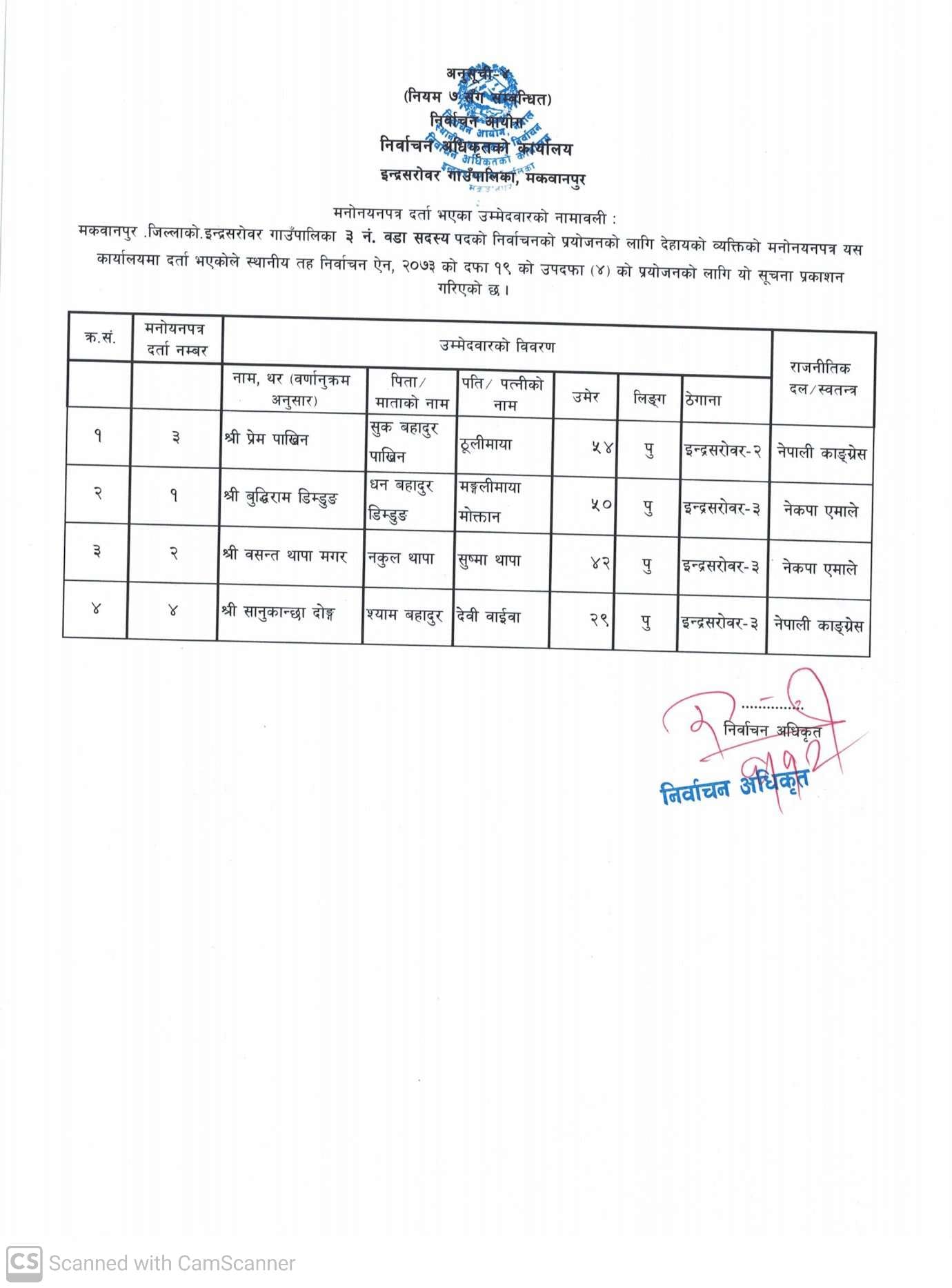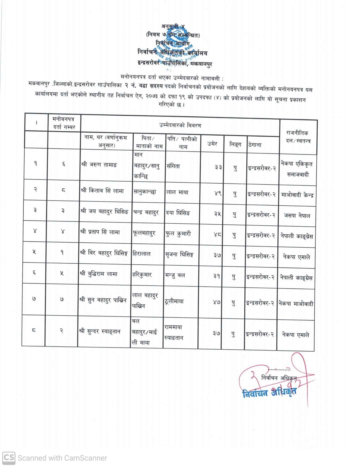 त्यसैगरी ५ अध्यक्षका लागि २२ जनाको उमेद्वारी परेको छ भने १० वडा सदस्यका लागि ३५, ५ जना महिला सदस्यको लागि १८ र ५ जना दलित महिला सदस्य पदको लागि ११ जनाको उमेद्वारी परेको स्थानीय तह सदस्य निर्वाचन अधिकृतको कार्यालयले सार्वजनिक गरेको सूचनामा उल्लेख गरिएको छ ।