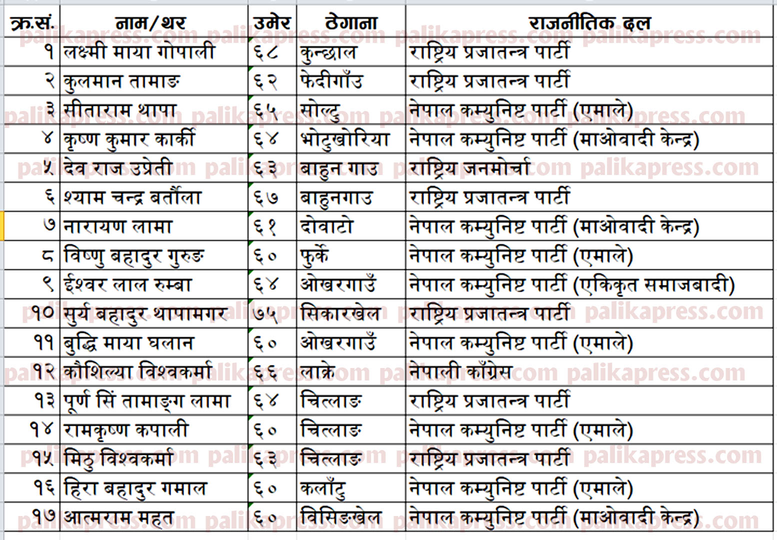 थाहानगरका ज्येष्ठ नागरिक उमेद्वार हुनेमा सबैभन्दा बढि राष्ट्रिय प्रजातन्त्र पार्टीबाट ६ जना रहेका छन् भने नेकपा एमालेबाट ५ जना, नेकपा माओवादी केन्द्रबाट ३ र नेपाली काँग्रेस, नेकपा एकीकृत समाजवादी तथा राष्ट्रिय जनमोर्चाबाट १/१ जना उमेद्वार छन् ।