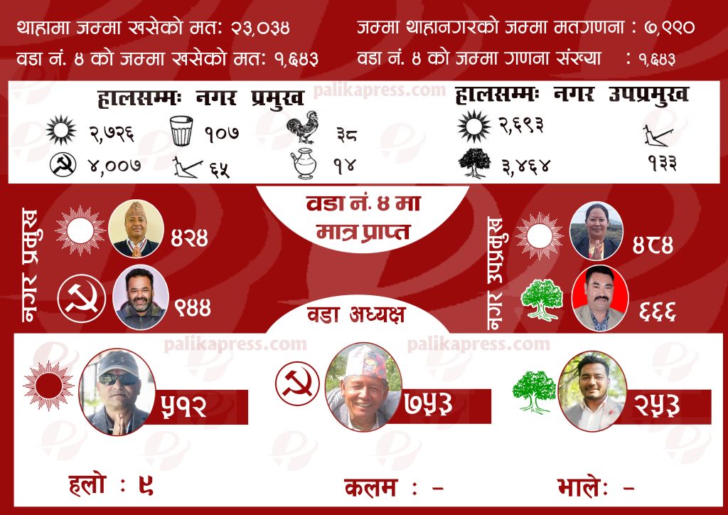 मकवानपुर थाहा नगरपालिकाको नगर प्रमुख (मेयर)मा विष्णु विष्ट ‘आदर्श’ ले नै अग्रता लिएका छन् । चार वटा वडाको मतगणनासम्म उनको मत ४ हजार ७ पुगेको छ । निकटतम प्रतिद्वन्द्धी एमालेका अच्युतम प्रसाद ढकालको २ हजार ७२६ रहेको छ ।
