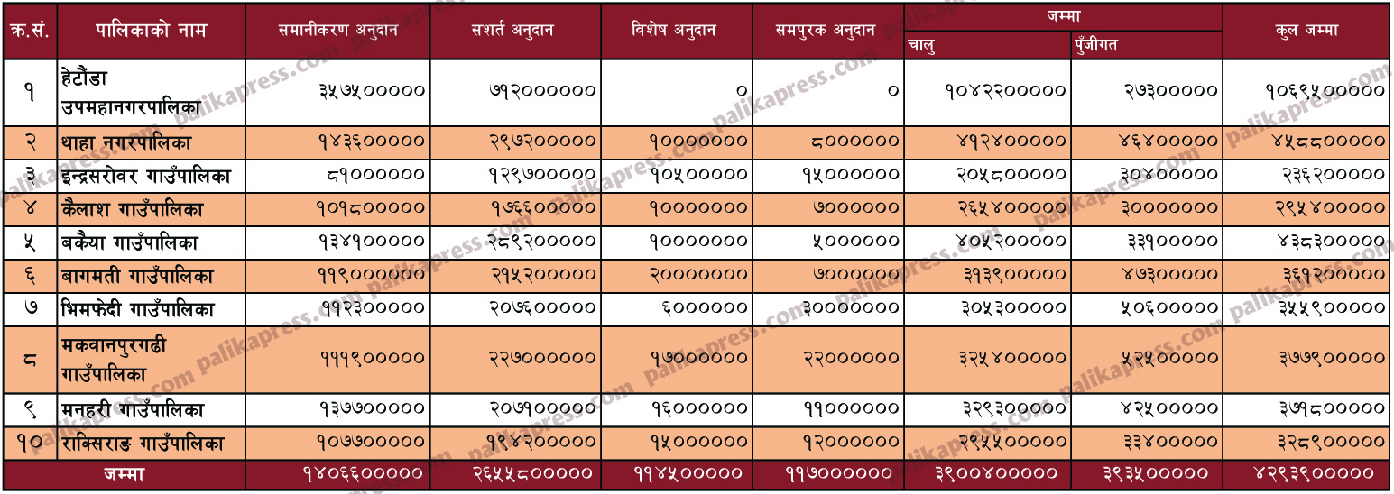 मकवानपुरका स्थानीय तहले पाएको बजेट यस्तो छः