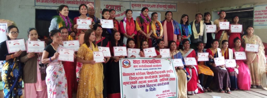 विद्यालय जाने उमेरमा विद्यालय छाडेका थाहा नगरपालिकाका २४ जना किशोरीहरुले एक हप्ते क्रिस्टलको गहना बनाउने तालिम लिएका छन् । थाहा नगरपालिका महिला, बालबालिका, ज्येष्ठ नागरिक तथा अपाङ्ग परिचय पत्र वितरण शाखाले नगरको वार्षिक स्वीकृत कार्यक्रम अन्तर्गत् विद्यालय छाडेका किशोरीहरुलाई तालिम दिएको हो ।
