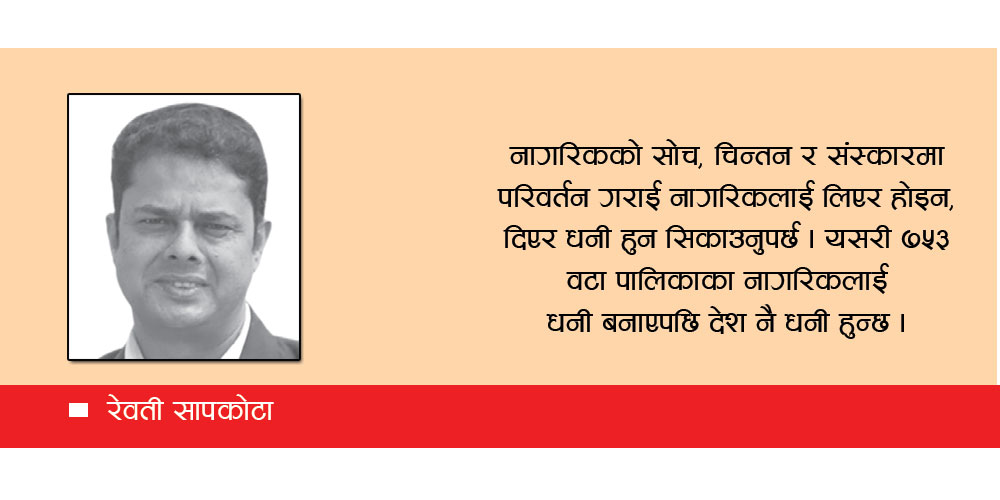 त्यसले ग्रामीण अर्थतन्त्रलाई माथि उठाउनुपर्छ । नागरिकको सोच, चिन्तन र संस्कारमा परिवर्तन गराई नागरिकलाई लिएर होइन, दिएर धनी हुन सिकाउनुपर्छ । यसरी ७५३ वटा पालिकाका नागरिकलाई धनी बनाएपछि ती पालिका धनी हुन्छन्, ती पालिका धनी भएपछि नेपाल नै धनी हुन्छ ।