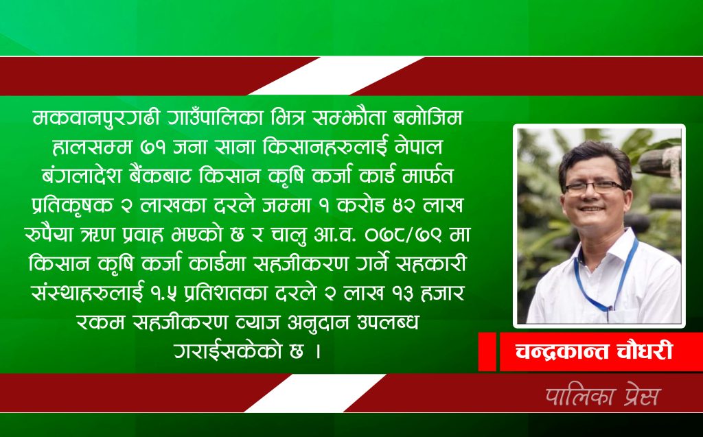 मकवानपुरगढी गाउँपालिका भित्र सम्झौता बमोजिम हालसम्म ७१ जना साना किसानहरुलाई नेपाल बंगलादेश बैंकबाट किसान कृषि कर्जा कार्ड मार्फत प्रतिकृषक २ लाखका दरले जम्मा १ करोड ४२ लाख रुपैया ऋण प्रवाह भएको छ र चालु आ.व. ०७८/७९ मा किसान कृषि कर्जा कार्डमा सहजीकरण गर्ने सहकारी संस्थाहरुलाई १.५ (डेड) प्रतिशतका दरले २ लाख १३ हजार रकम सहजीकरण व्याज अनुदान उपलब्ध गराईसकेका छन् । जसमा मनकामना दुग्ध उत्पादक सहकारी संस्था लि.मकवानपुरगढी ३ मक्रान्चुलीमा आवद्ध ३३ जना कृषक, समुन्नती वनजन्य उत्पादन तथा विविधिकरण सहकारी संस्था लि. वडा नं. ५ लिङेडाँडामा आवद्ध १० जना कृषक, वुद्ध दुग्ध उत्पादक सहकारी संस्था लि. वडा नं. ५ सोलिथुम चुहारमा आवद्ध १० जना कृषक, तिलगंगा महिला बहुउदेश्यीय सहकारी संस्था लि. वडा नं. ५ सिमलटारमा आवद्ध १० जना कृषक र जनजागृति दुग्ध उत्पादक सहकारी संस्था लि. वडा नं. ७ सुकौरामा आवद्ध ८ जना कृषकहरु रहेका छन् । यसरी किसान कृषि कर्जा कार्ड पाउनेमा महिला कृषक ३७ जना र पुरुष कृषक ३४ जना रहेका छन् ।