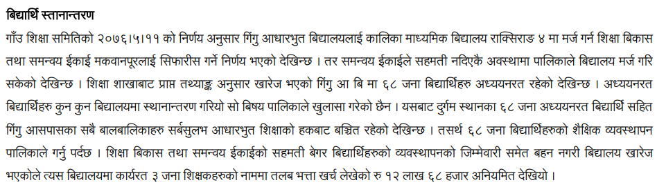 यसैगरी गाउँपालिकाले मर्ज भएको बिद्यालयलाई १२ लाख ६८ हजार रकम निकासा गरेको महालेखा परिक्षकको कार्यालयले आर्थिक वर्ष २०७७–०७८ को लेखा परिक्षण गरेर हालसालै सार्वजनिक गरेको प्रतिवेदनमा उल्लेख छ । राक्सिराङको गिंगु आधारभूत विद्यालयलाई कालिका माध्यमिक बिद्यालयमा मर्ज गरिएको तर, शिक्षकको तलब भने त्यही मर्ज भएको बिद्यालयमा निकासा गरिएको महालेखा परिक्षकको कार्यालयको प्रतिवेदनमा उल्लेख छ ।