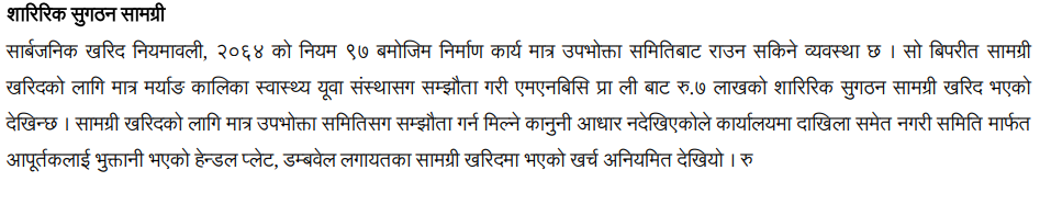 मकवानपुरको राक्सिराङ गाउँपालिकामा उपभोक्ता समितिबाट सामान खरिद गरेको पाइएको छ । गाउँपालिकाले सामान खरिद गर्दा उपभोक्ता समिति मार्फत सामान खरिद गर्न नमिल्ने कानूनी व्यवस्था रहेको छ । तर, गाउँपालिकाले ७ लाख रुपैयाँ बराबरको बिभीन्न सामान खरिदको काम भने मर्याङ कालिका स्वास्थ्य युवा संस्थासंग संझौता गरेर शारिरिक सुगठन सामाग्री खरिद गरेको महालेखा परिक्षकको कार्यालयले जनाएको छ ।