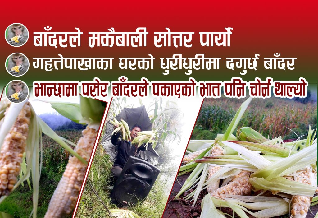 बल्ल–बल्ल रासायनिक मल बटुलेर मकै फलाएका खोलाखर्कका किसानहरुलाई अहिले बाँदरको वितण्डा खेपी नसक्नु छ । मान्छे बराबर अग्ला मकैका बोट ढालेर बाँदरले घोगा नङ्ग्याउँदै बारीमै फालिदिएको छ । बाँदर पसेर खानू खाँदोरेछन् नत्र सबै बिगारेर बारीमै रहिमट्ट पारेको छ,–कृषक वीरसिंह वाइवाले भने–‘दिनदिनै डोकाको डोडा खोया घरमा ओसार्नु परेको छ ।’ घाम पानी भोक प्यासको प्रवाह नगरी हुर्काएको मकै भित्र्याउने बेला बँदेलले सखाप पारेपछि गाउँभरीका किसान चिन्तित् बनेका छन्।