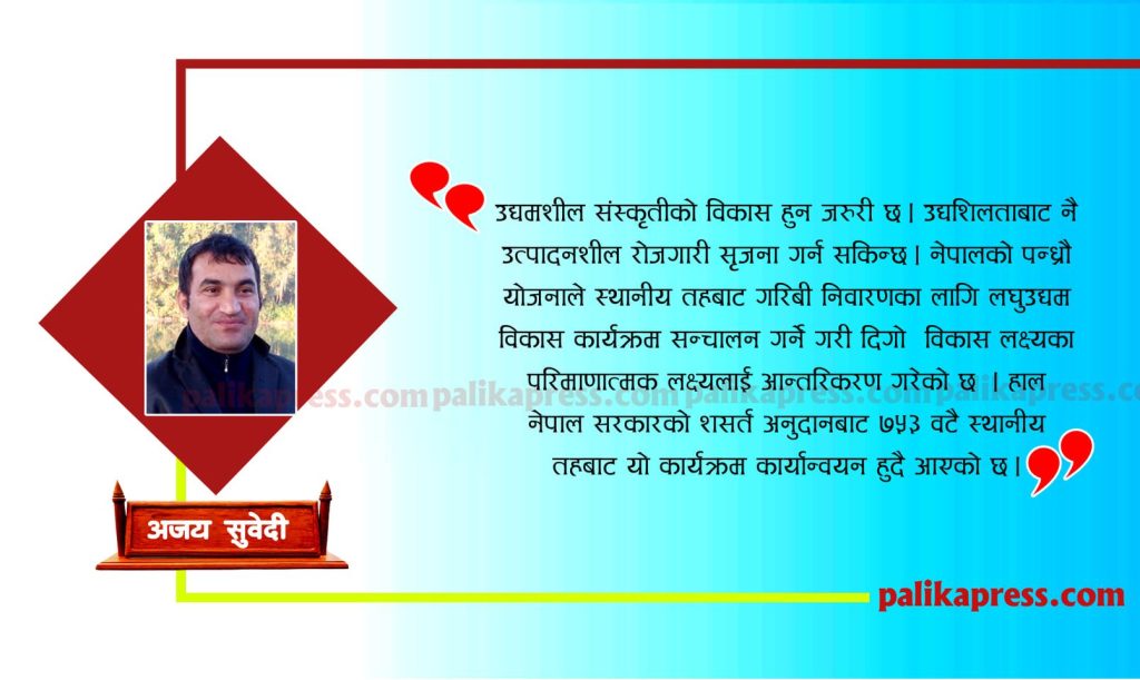 नेपाल सरकारले समृद्ध नेपाल सुखी नेपालीको दीर्घकालीन सोच सहितको पन्ध्रौ योजना कार्यान्वयनमा ल्याएको छ ।यसका लागि मानव पुँजी निर्माण तथा सम्भावनाको पुर्ण उपयोग गरिने गरी समृद्धिको गोरेटो समेत तय गरेको छ । गरिबी निवारण बिना कुनै पनि विकासका आयमहरुवाट सकारात्मक नतिजा प्राप्त गर्न नसकिने यथार्थ हामी सामु रहेको छ । नेपालको नवौ पन्चबर्षिय योजनाबाट गरिबी निवारणलाई पहिलो प्राथामिकता दिदै आएको छ । यसका लागि उद्यमशील संस्कृतीको विकास हुन जरुरी छ । उद्यशिलताबाट नै उत्पादनशील रोजगारी सृजना गर्न सकिन्छ । नेपालको पन्ध्रौ योजनाले स्थानीय तहबाट गरिबी निवारणका लागि लघु उद्यम विकास कार्यक्रम सन्चालन गर्ने गरी दिगो विकास लक्ष्यका परिमाणात्मक लक्ष्यलाई आन्तरिकरण गरेको छ । हाल नेपाल सरकारको शसर्त अनुदानबाट ७५३ वटै स्थानीय तहबाट यो कार्यक्रम कार्यान्वयन हुदै आएको छ ।