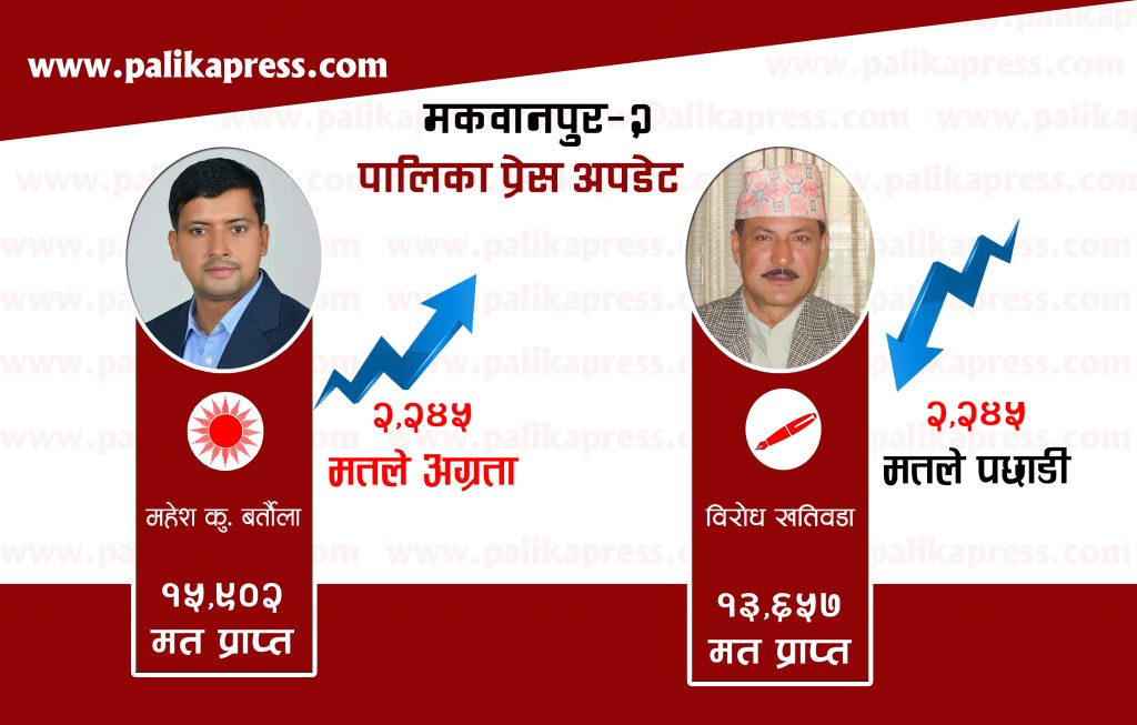 मकवानपुर प्रतिनीधि सभा क्षेत्र नम्बर २ मा एमालेका महेश बर्तौलाले सत्ता गठबन्धनका उमेद्वार विरोध खतिवडालाई २ हजार बढि मतले पछि पारेका छन् ।